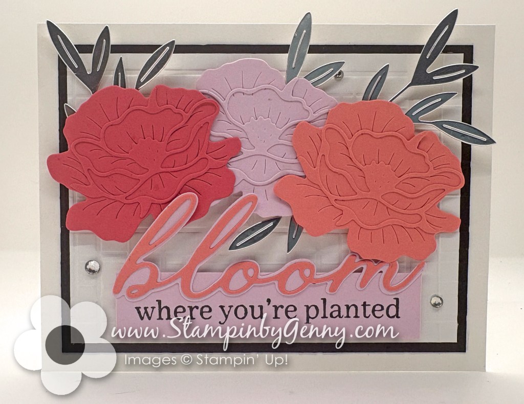 This week’ color color challenge of Strawberry Slush, Flirty Flamingo and Bubble Bath at Hand Stamped Sentiments inspired me to create this card with the Floral in Blooms Suite Collection. The flowers are each of the challenge colors, the foliage is die cut from silver foil and the white background is embossed with the Forever Plaid 3D Embossing Folder. The word bloom is die cut from Flirty Flamingo and Bubble Bath. The sentiment ‘where you’re planted’ is stamped with Memento Tuxedo Black. For some added sparkle I used Basic Rhinestones.