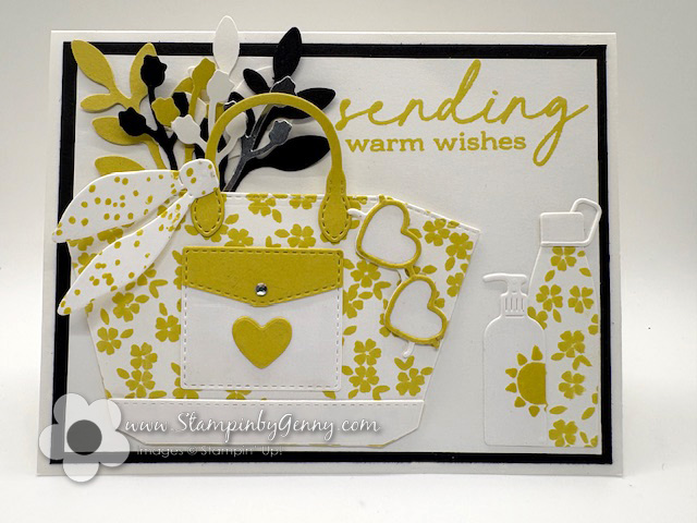 Hello! This week’s challenge at Hand Stamped Sentiments I was inspired by the yellow images on the mood board. Since I don’t have any sports stamps I was inspired by the yellow color of the shirt and the black and white of the flags. I used the Notes and Totes bundle to create this card and I challenged myself to try to use as much of the bundle as possible. It was so much fun making the cute tote then filling it with foliage. This card is a birthday card for a dear friend.