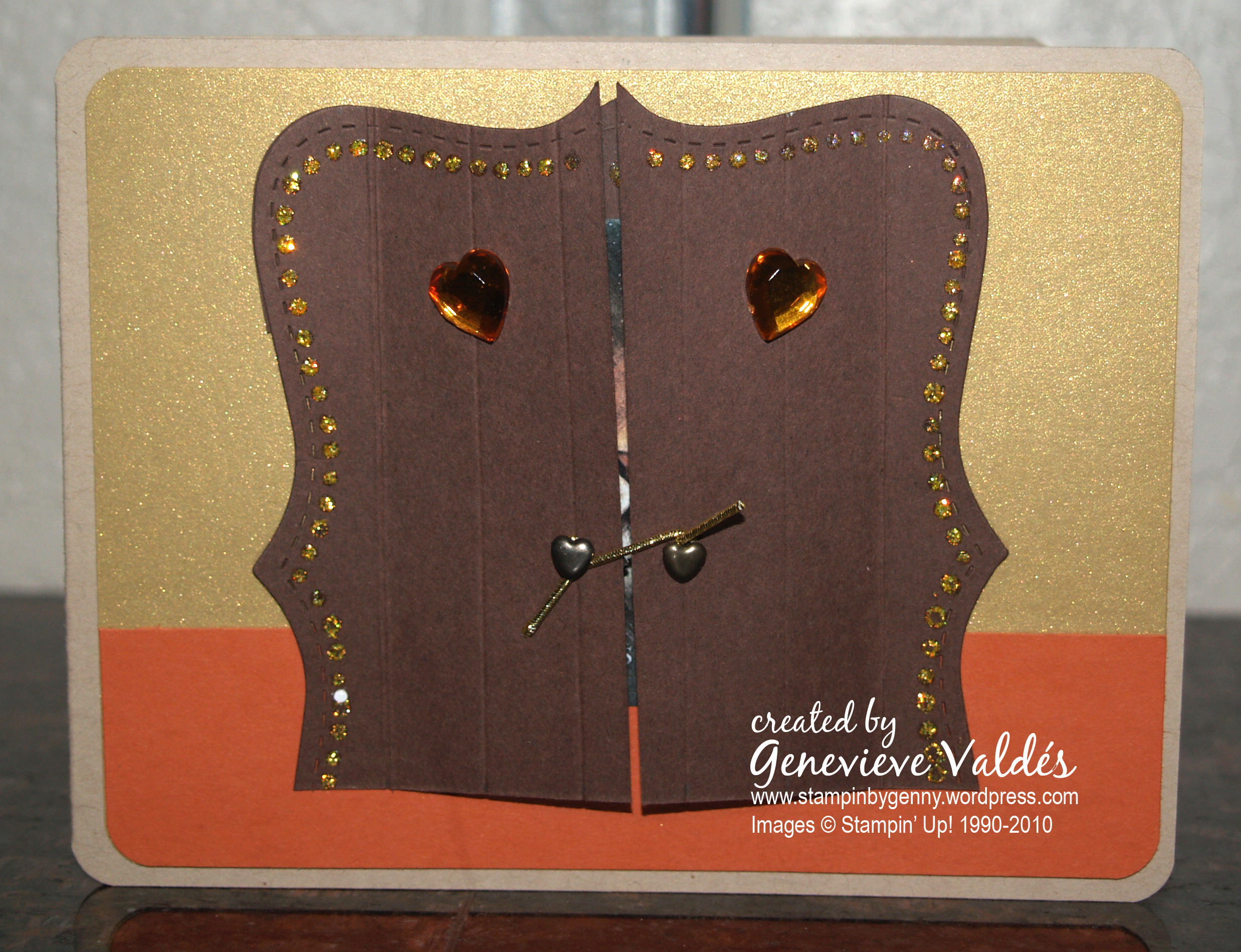 Accessories: SU paper snips, SU gold elastic cord, SU The Big Shot and Top Note Die , SU Snail, SU gold embossing powder and heat set with SU heat tool, heart gemstones, yellow glitter glue, heart brads