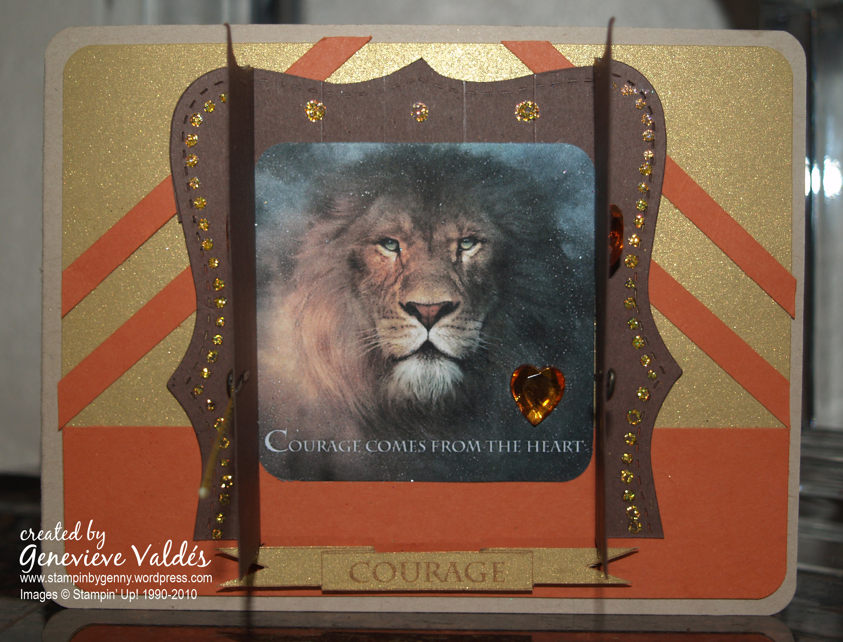Here is the card I created for the The Chronicles of Narnia challenge. A great movie with so much inspiration – colors, scenes, characters and sentiments. The most memorable character in the film for me is Aslan. Maybe it’s because I love big cats. His courage and strength are what make his character bigger than life not mention he is big and sometimes ferocious. I decided to create a card about his courage.