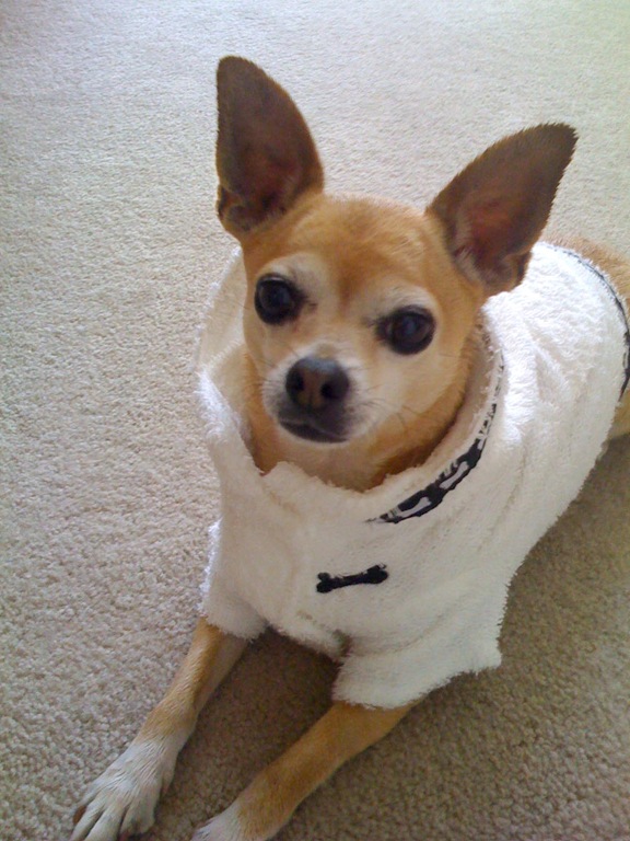 Our fur family started with me acquiring Chula, a beautiful fawn colored Chihuahua. She was given to us by a family that was too busy with real children. I’ve never been sorry to have her. She has such a sweet personality and is very loving. And like her mother she loves to eat. Here she is in her robe drying after a bath. This and her winter coat are her only clothes. My husband won’t allow for other clothing. I’m working on getting her a rain coat.