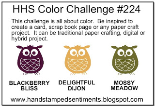 This week’s challenge at Hand Stamped Sentiments is a color splash challenge with the  beautiful rich colors of Blackberry Biss, Delightful Dijon and Mossy Green.  These colors are perfect for creating a fall project.  Once again I was inspired by a project on page 65 of the 2015-2016 Catalog and Idea book.  With so many little things that sometimes go wrong in life, the greeting is a perfect sentiment to maintain perspective.  The Perfect Pennants stamp set, Banner framelits along with the Bow Builder punch made it easy to create this card.