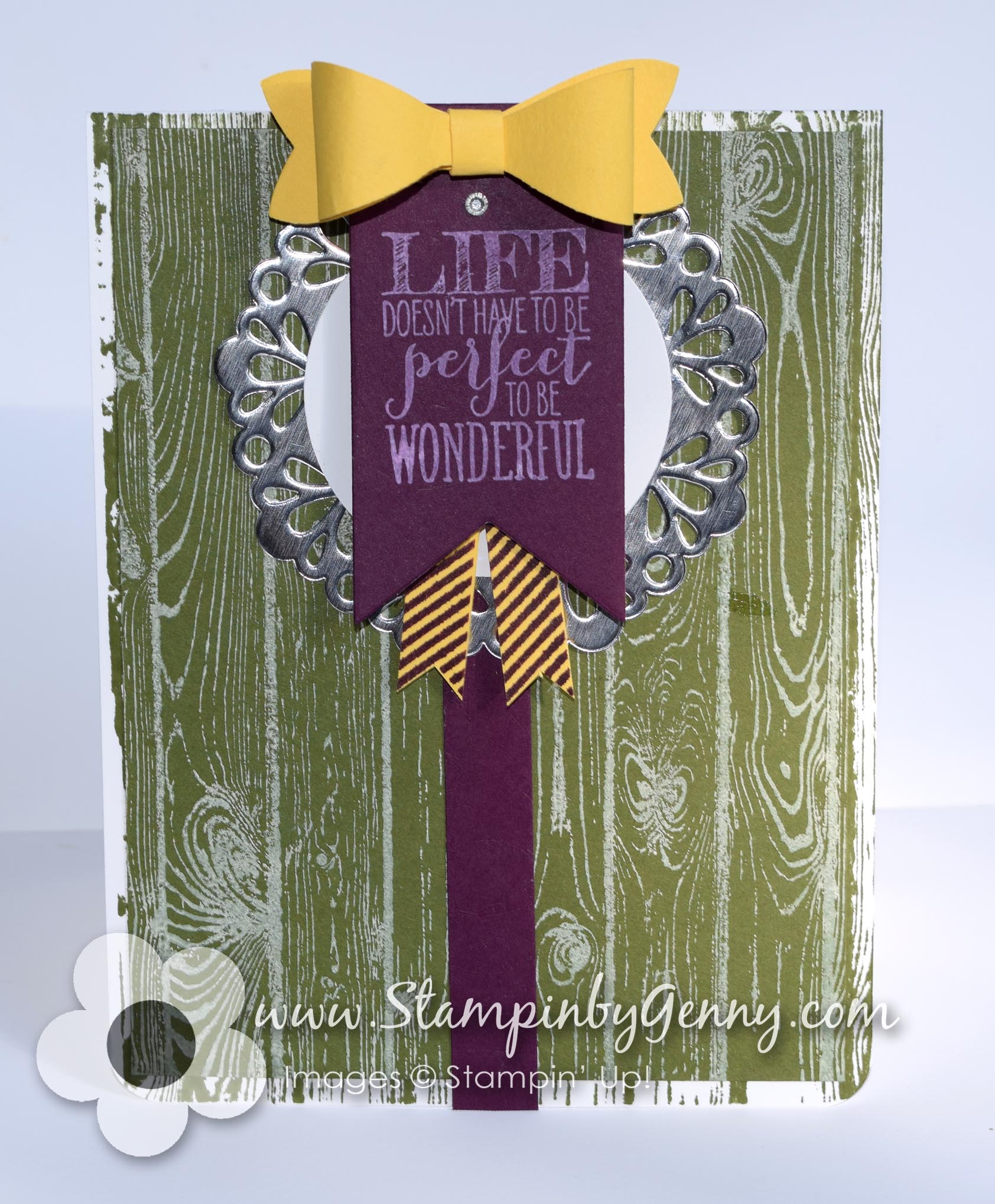 Stampin Up card created with Perfect Pennants stamp set and Hardwood background Bow Builder Punch