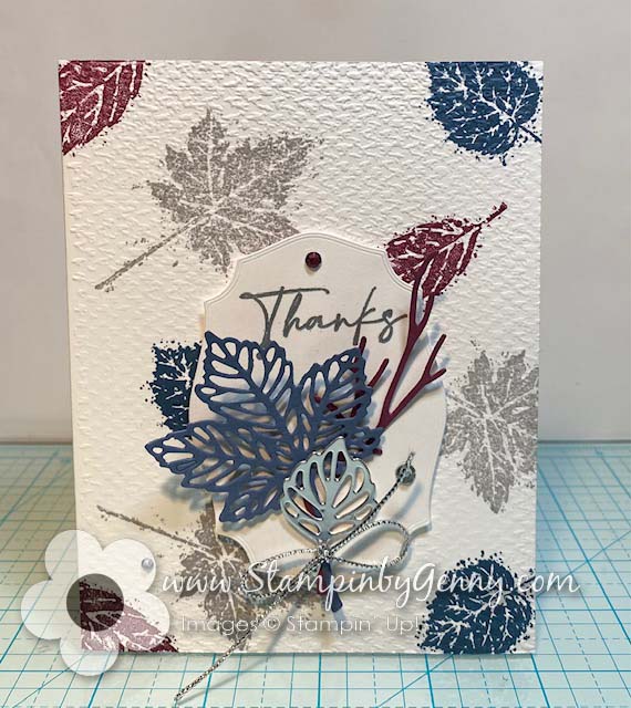 I started with a Basic White card base then stamped the leaves with Misty Moonlight, Rich Razzleberry and Smoke Slate. After stamping the leaves I embossed the background with the Tasteful Textile Embossing Folder. The sentiment from Hand Penned Petal stamp set I stamped with Versamark on a die cut label from the Tasteful Label dies then heat embossed with silver embossing powder. The large Misty Moonlight leaf, Silver foil small leaf an Rich Razzleberry twig I die cut using the Intricate Leaves dies, embellished with silver twine from the Simply Elegant trim basic rhinestones colored with Rich Razzleberry, Smokey Slate and Misty Moonlight Stampin Blends.