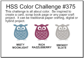 My card was inspired by the Hand Stamped Sentiments color challenge of Misty Moonlight, Rich Razzleberry, Smokey Slate and CASED from Amy Koenders Gorgeous Leaves card.