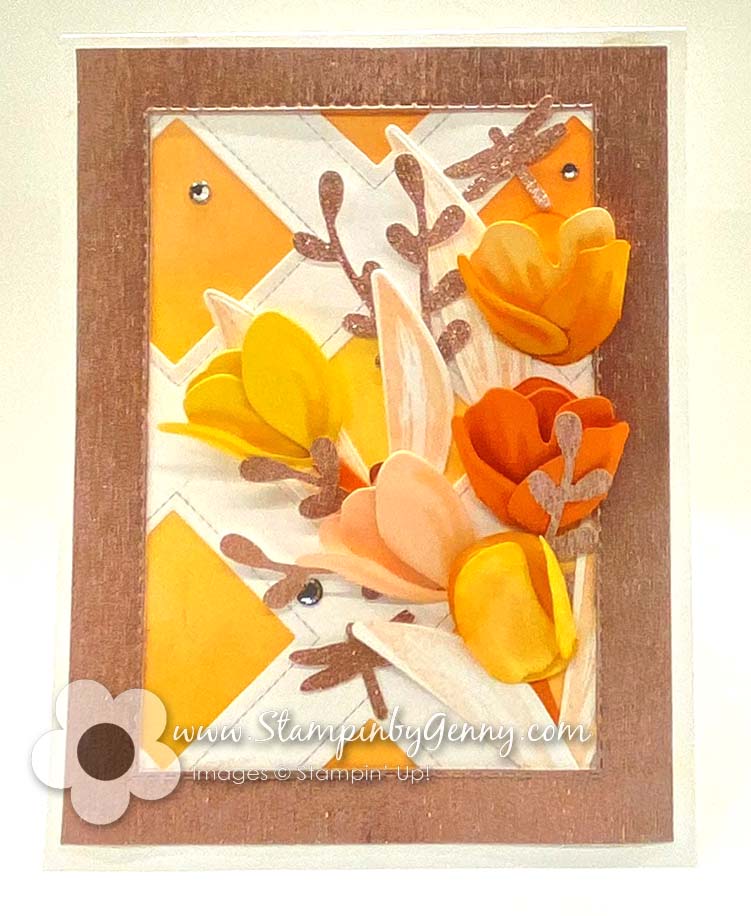 Accessories: Tulips Dies, retired Stitched Shapes dies, Sprig Punch, Dragonflies Punch, Glue dots, blending brushes, Basic Rhinestones, Bone Folder