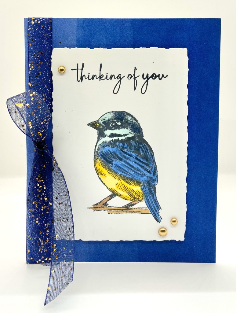 Ink: The bird and sentiment were stamped in Memento black 132708. The bird was colored with Stampin’ Blends – Pool Party, Night of Navy and Daffodil Delight.