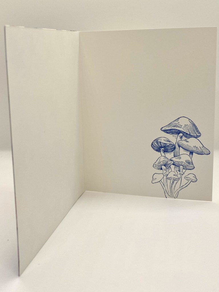I stamped the bird from the Inspirational Sketches stamp set with Memento Black and colored with Stampin’ Blends – Pool Party, Night of Navy and Daffodil Delight on a layer die cut from the Deckled Rectangle Dies. The sentiment is from the Excellent Eggs stamp set and stamped with Memento Black. The blue background paper is DSP is from the Bright & Beautiful 6″ x 6″ pack. The ribbon is Night of Navy & Gold. I embellished with Brushed Metallic adhesive dots. The inside of the card I stamped the mushroom image in Blueberry Bushel.