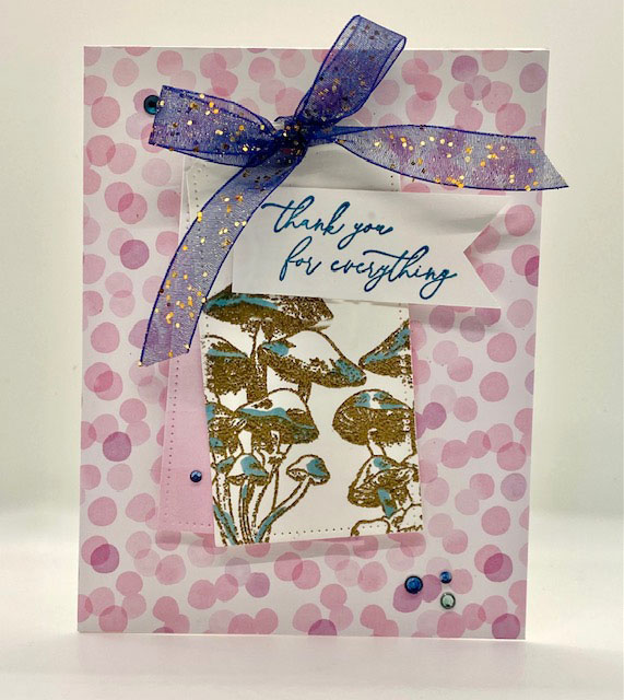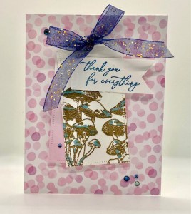 Ink: The mushrooms and sentiment were stamped in Versamark. The mushrooms were colored with Stampin’ Blends – Pretty Peacock.
