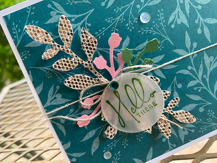 My card is based on Hand Stamped Sentiments color challenge of Garden Green, Pretty Peacock and Petal Pink. I used the Bough punch for the foliage in Garden Green, Petal Pink and More Dazzle card stock. The printed background layer if from the Masterfully Made DSP paper pack. The sentiment from Nature’s print is stamped on Vellum with Garden Green and die cut with the Stylish Dies circle die. The foliage is embellished with linen thread and Adhesive backed sequins in Pretty Peacock and white.