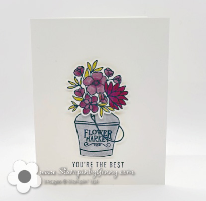 This week my card is inspired by the Stampin’ Up colors of Moody Mauve, Wild Wheat and Blackberry Bliss. I love these colors! I created a simple card with the Stampin’ Up Country Flowers stamp set and dies. I colored the flowers with Stampin’ Blends pens – Moody Mauve, Wild Wheat and Blackberry Bliss. I colored the container with Smoky Slate. The images I stamped with Memento Black. Then die cut them with the Country Flowers dies.