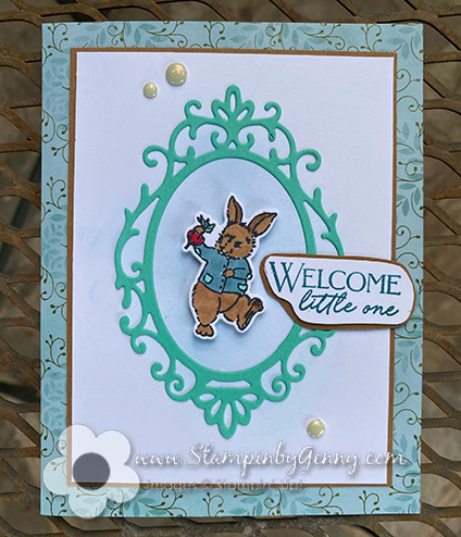 The card base is basic white and the DSP is from the 12″ x 12″ Storybook Moments Specialty Designer Series Paper. The next cardis layer is Pecan Pie following by basic white sponged with Summer Splash ink. The frame and bunny are die cut using the Storybook Friends Dies. The bunny I colored with Stampin’ Blends of Summer Splash, Pretty Peacock, Pecan Pie and Real Red. The greeting is from the Storybook Friends stamp set and stamped in Pretty Peacock. I fussy cut the greeting and layered with Pecan Pie. The card is embellished with Antique Pearls.