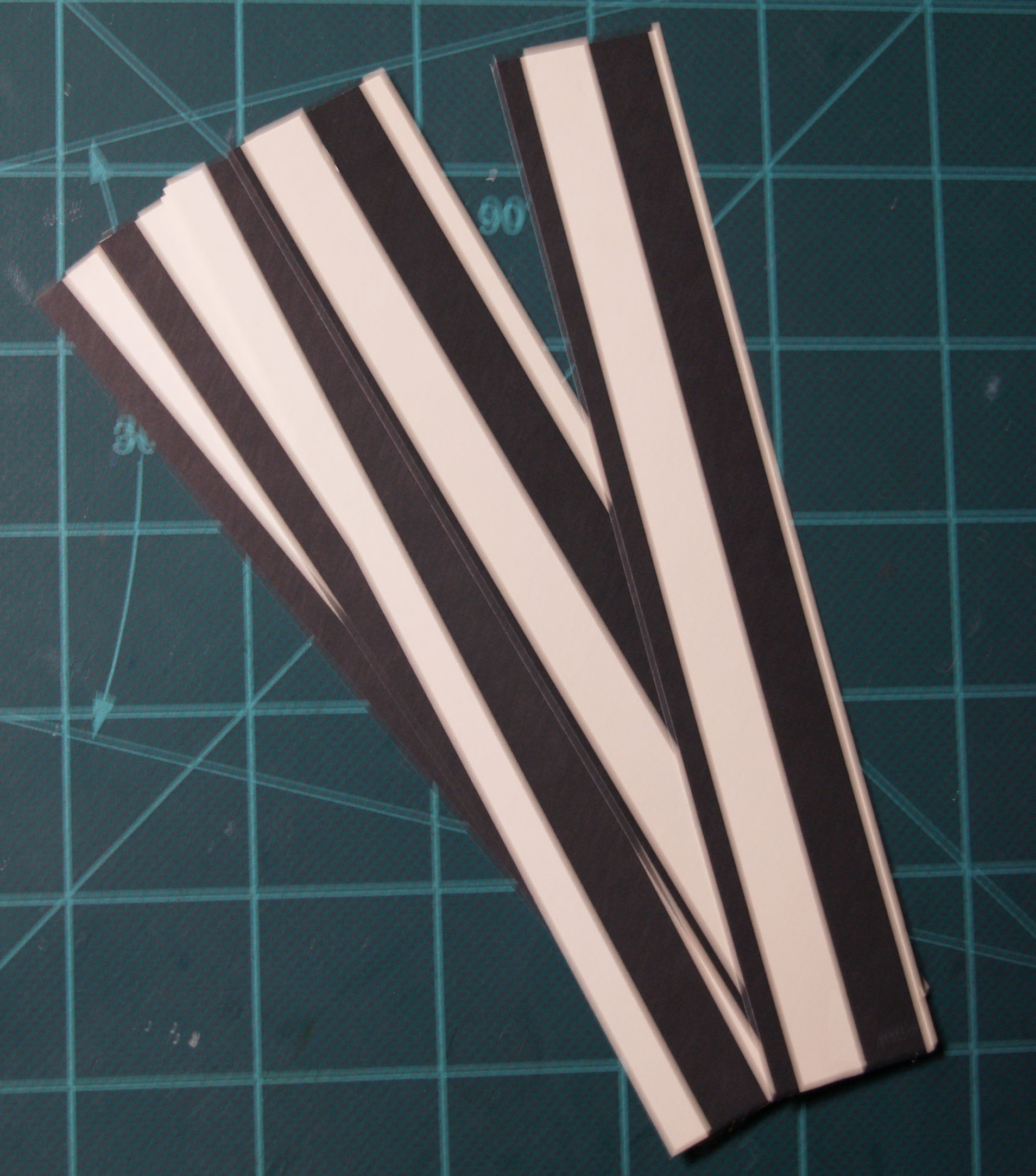 First cut 12 strips of paper 1″ x 6″. The smaller pumpkin is made with ¾” x 4” strips.