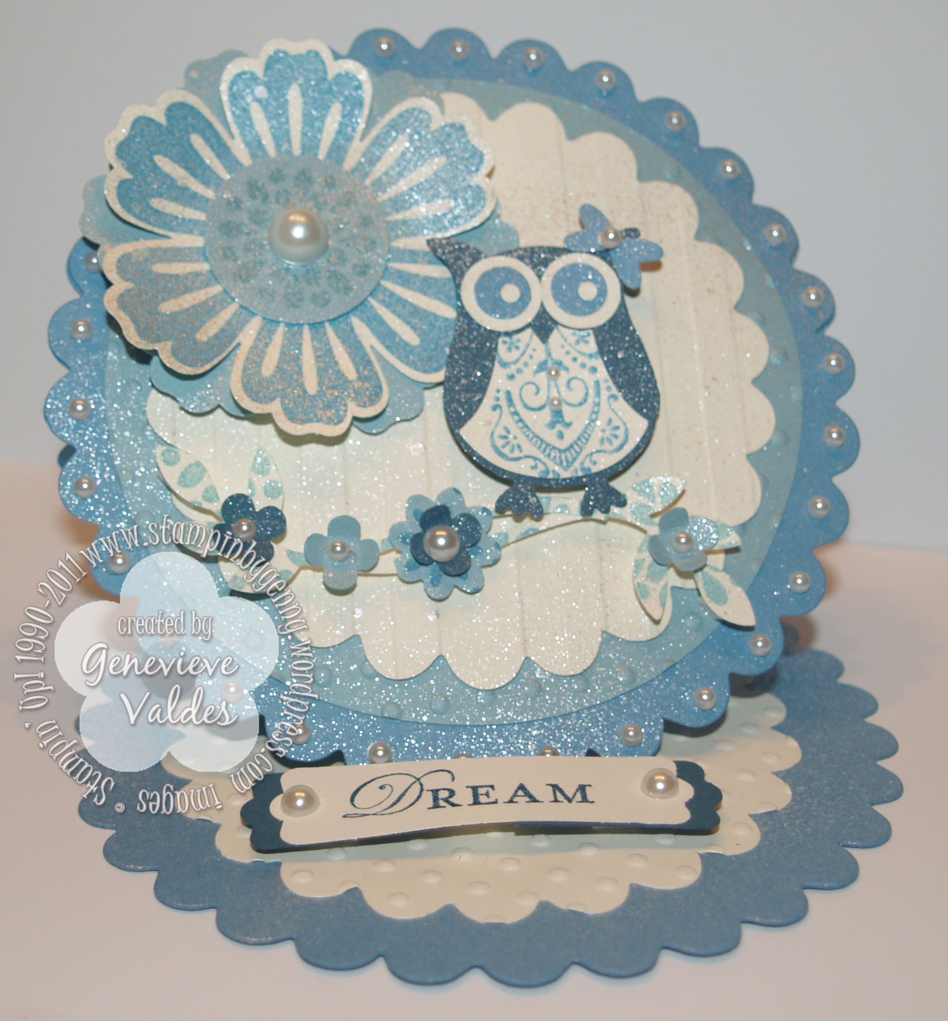 I cut a Soft Suede 5″ circle and a 4-1/2″ Very Vanilla circle with my retired Stampin’ Up! Circle Scissor Plus. I embossed the Very Vanilla circle with the Perfect Polka Dot folder then folded them in half and glued them together.