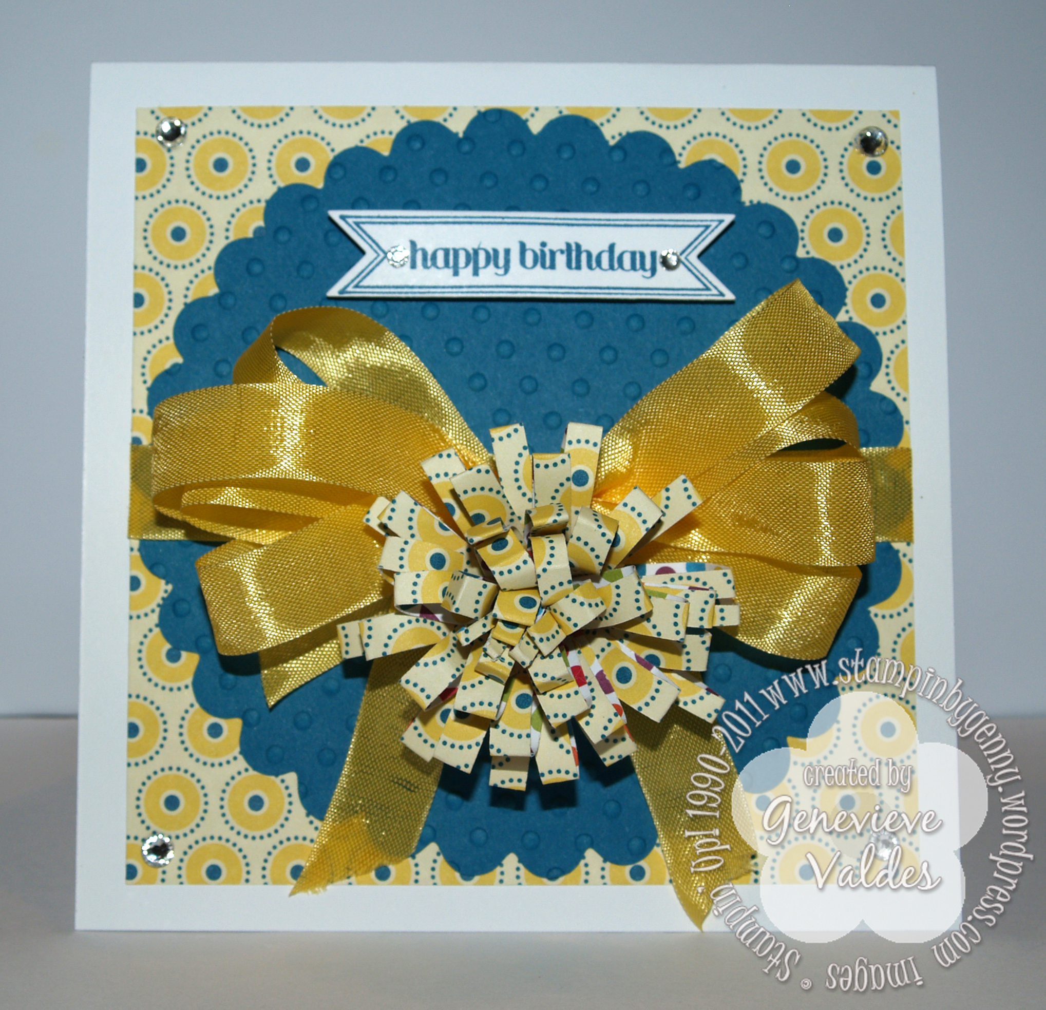 I have also included a card featuring the All Dressed up Bundle. See page 32 of the Spring Catalog. This bundle is a must-have. I used many items from the new catalog. Do you see those luscious huge rhinestones? They’re new! A new 8mm rhinestone is now available (page 8). Another new item is the paper doily (page 5). The dress and stand is die cut using the Dress Up Framelits. So cute!! In case you’re wondering about the layout, it’s based on the sketch for this week’s Mojo Monday sketch.