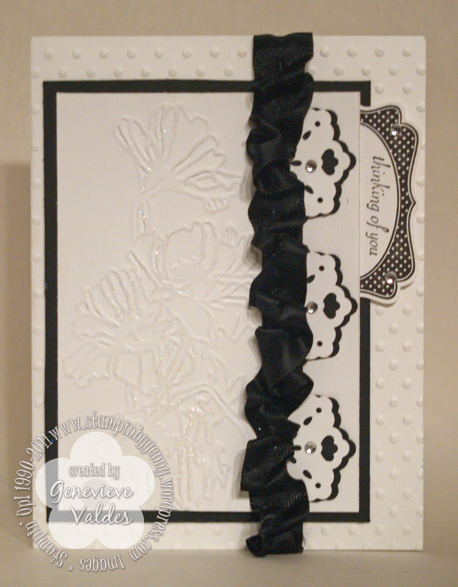 Accessories: Dimensionals, Basic Pearls, Doily Triple Layer Punch, Decorative Label Punch, Punch Pack Punches, Old Olive Satin Ribbon, Big Shot, Circle Scallop die, Finial Press Embossing Folder, Perfect Polka Dot Embossing Folder