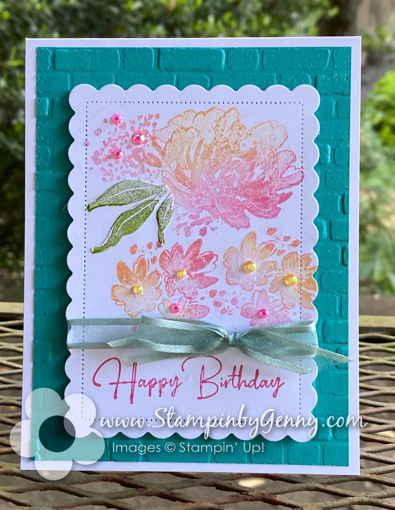 Flowers were stamped in Memento black 132708 and colored with Polished Pink; leaves were colored with Stampin’ Blends Granny Apple. The background was wate rcolored using the watercolor brush 151298