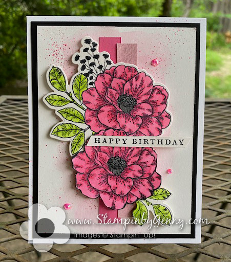 I used Polished Pink Stampin’ Bends to color the flowers and Granny Apple Stampin’ Blends to color the leaves. I used Smoky Slate Stampin’ Blends for the flower centers. The background I water colored with Polished Pink then splattered with polished pink using a water color brush. The strips of designer series paper are from the Awash in Beauty. I used 3 of the retired Polished Pink Gems.
