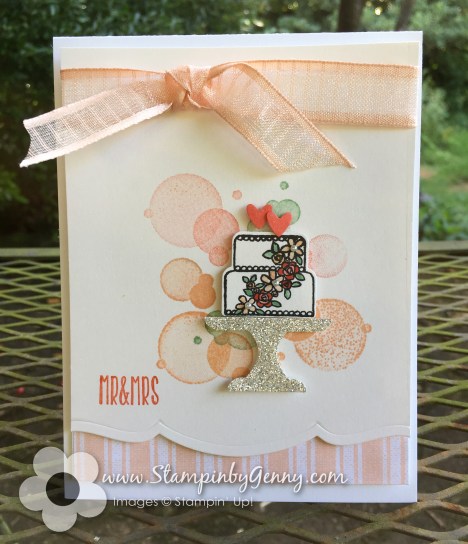 I hadn’t had an opportunity to use the Piece of Cake stamp set and Cake Builder punch and was inspired by the color challenge of Petal Pink, Mint Macaron and Calypso Coral at Hand Stamped Sentiments to create a wedding card. This summer I’ll be going to my nephew’s wedding and want to be ahead and get my card made. I like to have different types of cards handy so I made a couple of wedding cards with this color combo.