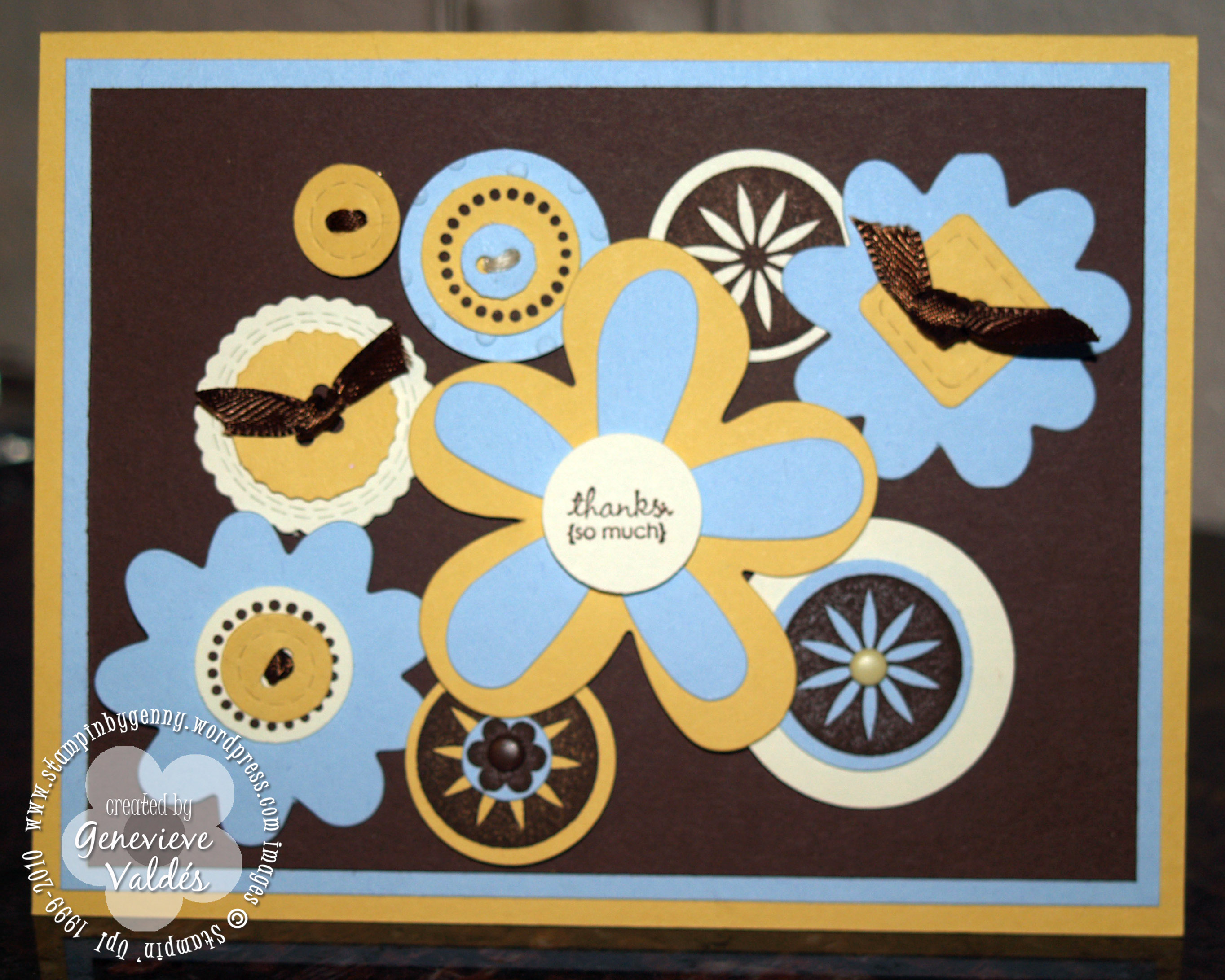 Accessories: Festive Flower Builder Punch, retired Frosted Finishes Embellishments, Gold Cording Trim, Gold embossing powder, Curvy Corner Trio punch